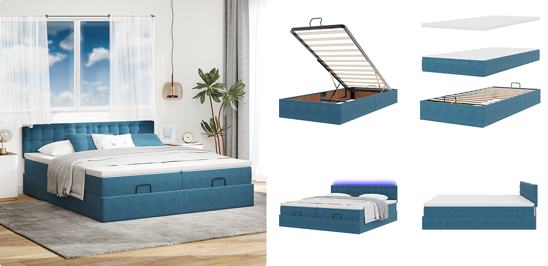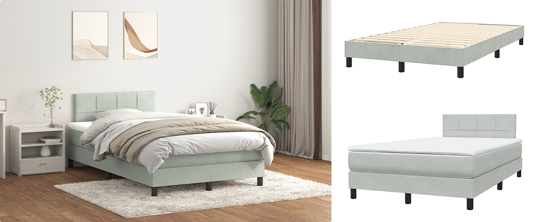 Този комплект легла включва рамка за легло, матрак с покет пружини и мек топ матрак за пълен комфорт. Кадифената рамка придава уют, а пружините с джобчета осигуряват персонализирана опора и намаляват предаването на движенията. Ламелната основа осигурява допълнителна дишаемост, като поддържа матрака свеж. Това е идеалният комплект „всичко в едно“ за спокоен сън през нощта.