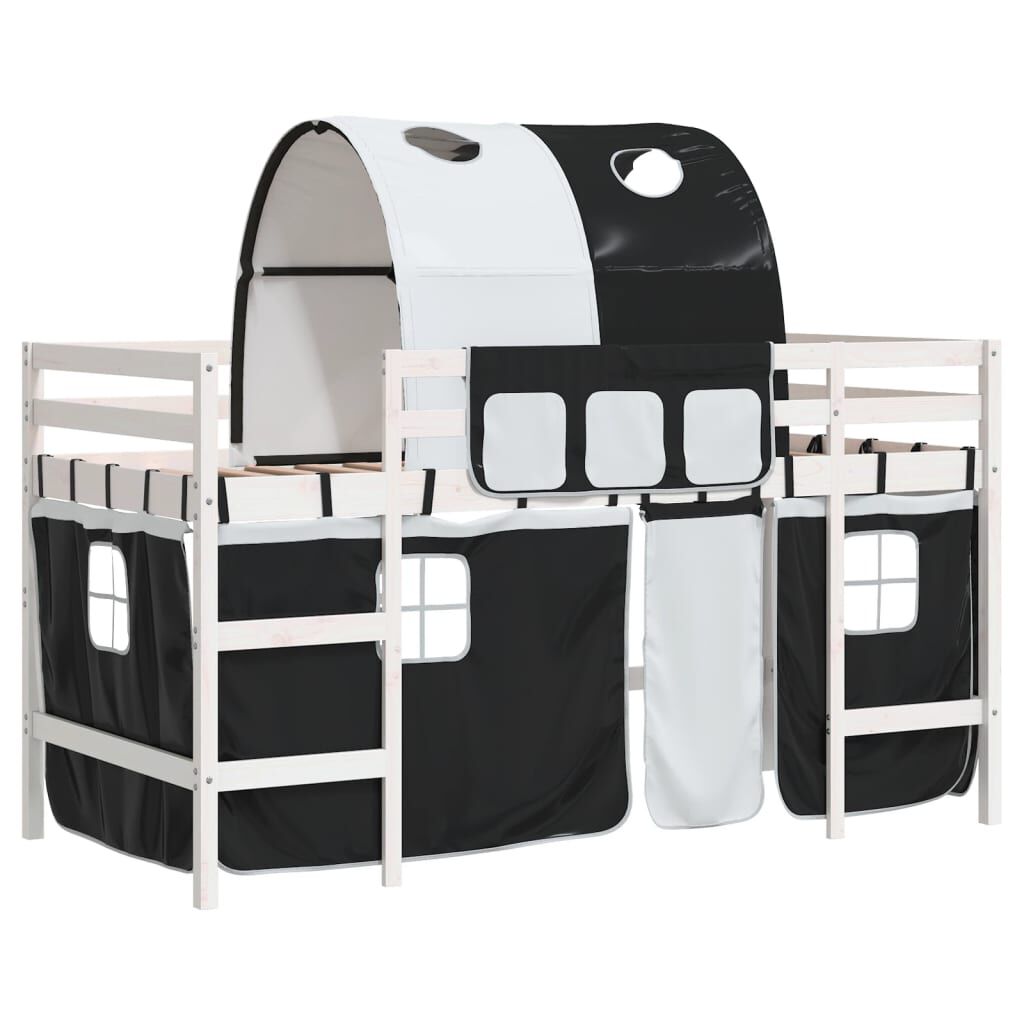 vidaXL Детско високо легло с тунел, бяло и черно, 90x200 см, бор масив