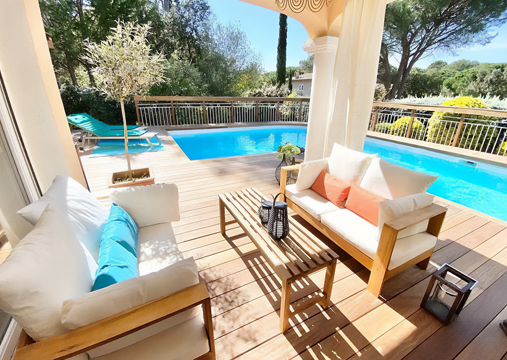 За да релаксирате, вие се нуждаете от спокойно пространство в курортен стил. Заложете на удобни мебели за открито, плюшени възглавници и уютни килими в нежно бяло, пясъчно бежово и океанско синьо. Използвайте естествени материали като ратан, тиково дърво и устойчива на атмосферни влияния ракита, за да завършите мечтаното си убежище.