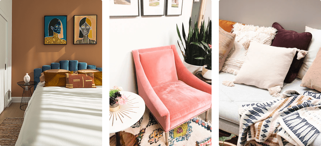 Завръщайки се към традиционната употреба на кадифе, виждаме смели и драматични цветове, съчетани с лъскави копчета или контрастни шевове. За да направите впечатление, изберете кадифе в скъпоценни тонове в тъмнозелено, тъмносиньо или виненочервено. Модерният подход към интериорния дизайн ни насърчава да използваме кадифето по по-изтънчен начин. За да добавите мека и закачлива нотка в дома си, изберете розово, зелено като патешко яйце или дори бяло кадифе. Не се притеснявайте да използвате по-светли цветове; ако изберете кадифе, което е третирано срещу разливания, мебелите ви могат да издържат цял живот.