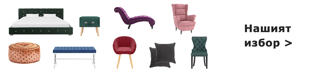 Кадифето е забележително само по себе си. Когато се използва като фокусна точка в интериорния дизайн, кадифето създава неповторима визия. В зависимост от помещението, което декорирате, изберете мебел от кадифе, която да привлича цялото внимание. Когато добавите кадифен диван във вашата всекидневна, той несъмнено ще накара стаята да заблести. Можете да избирате между кадифен диван Честърфийлд в ярки цветове и минималистичен диван с метални крака за по-модерен вид. С помощта на кадифено легло можете да придадете изисканост на спалнята си. Ако искате елегантна конфигурация на спалнята, изберете дизайн с детайли или отворете пространството със семпли линии в неутрални цветове. Препоръчваме ви да добавите и кадифен стол с висока облегалка, за да създадете уютен кът за релаксиращи следобеди. С кадифените трапезни столове можете да добавите нотка класа в трапезарията си. Тук можете да зададете тона, като изберете между модерен дизайн с плюшена кадифена текстура или викторианска тапицерия в по-тъмно кадифе..
